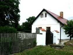 poloroubená chalupa z roku 1779 čp. 2. Vsí protéká Žebrákovský