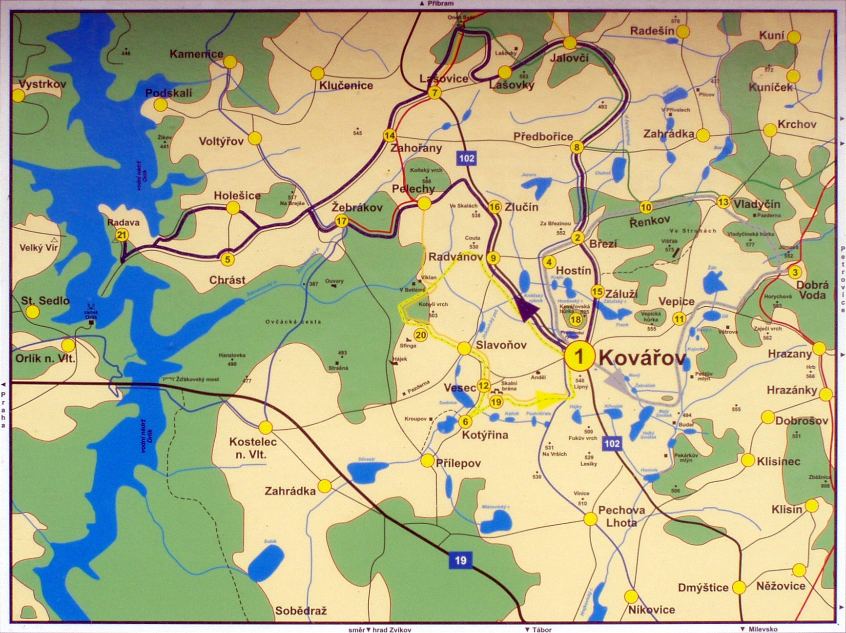 - modrý okruh (29 km) - 1 (Kovářov), 9, 16 (Zlučín), 17 (Žebrákov), 5 (Chrást), 21 (Radava), 14 (Záhořany), 7 (Lašovice), 8 (Předbořice), 2 (Březí), 15 (Záluží), 1 (Kovářov)